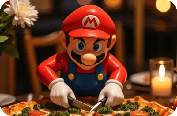सुपर मारियो एक आरामदायक मोमबत्ती की रोशनी वाली डिनर टेबल पर बैठा है, ब्रोकली और पेपरोनी के साथ पिज्जा खाने की तैयारी कर रहा है, नरम रोमांटिक लाइटिंग, गर्म बैकग्राउंड ब्लर, विस्तृत टेबल सेटिंग, मोमबत्तियाँ और फूल, यथार्थवादी 3D कार्टून रेंडर शैली, सनकी और विनोदी माहौल