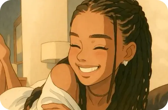 लच्छेदार बालों वाली एक मुस्कुराती हुई अश्वेत लड़की, नरम तकियों वाले बिस्तर पर लेटी हुई, आरामदायक बेडरूम की पृष्ठभूमि, गर्म रोशनी, पेस्टल रंग पैलेट, आँखें बंद, शांत और खुश अभिव्यक्ति, आधुनिक कार्टून/एनीमे हाइब्रिड शैली, साफ रेखाएं और नरम बनावट