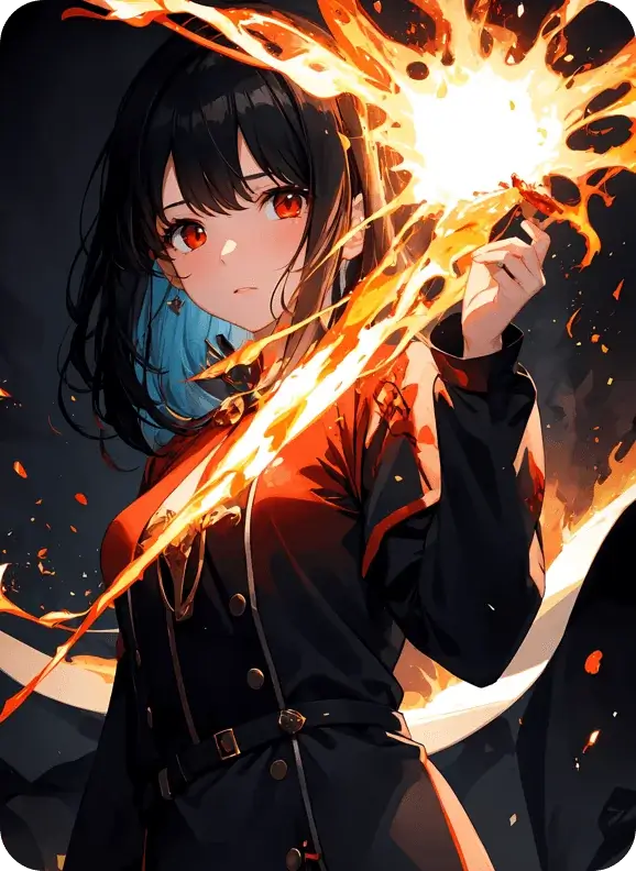 काले बाल और लाल आँखों वाली एनीमे लड़की, सैन्य-शैली की काली और लाल पोशाक पहने हुए, हाथ में आग का गोला लिए हुए, उसके चारों ओर जादुई आग के प्रभाव, गंभीर अभिव्यक्ति, नाटकीय प्रकाश व्यवस्था, गतिशील एक्शन पोज़, सिनेमाई पृष्ठभूमि, एनीमे फंतासी युद्ध अवधारणा, चमकते लौ कण