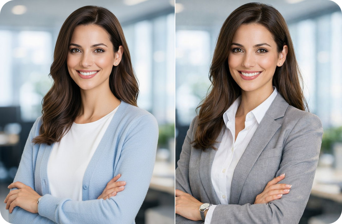 一款 AI 證件照生成器 是一款智慧工具,它利用機器學習來增強面部特徵、修正光線並替換背景,以創建 專業形象。它就像您的虛擬攝影師。 您可以將您的自拍照升級為高階商業照片,虛擬地更換您的服裝為西裝,並將背景調整為現代辦公室環境——直接在您的瀏覽器中操作。
